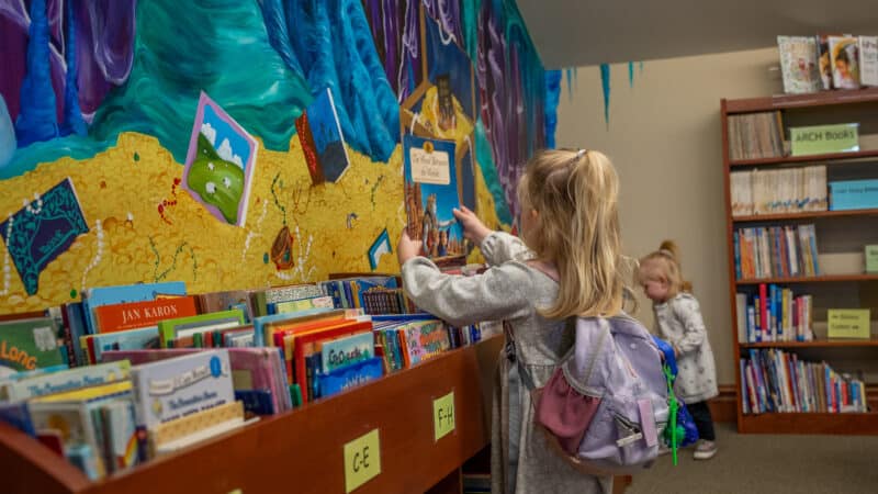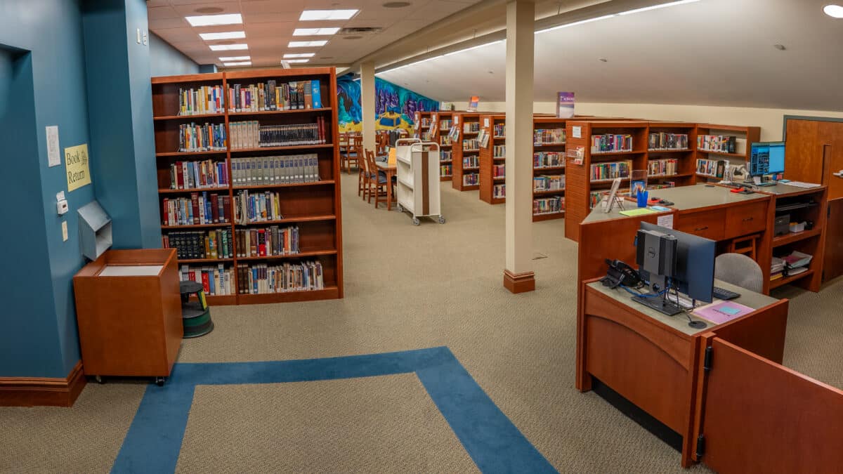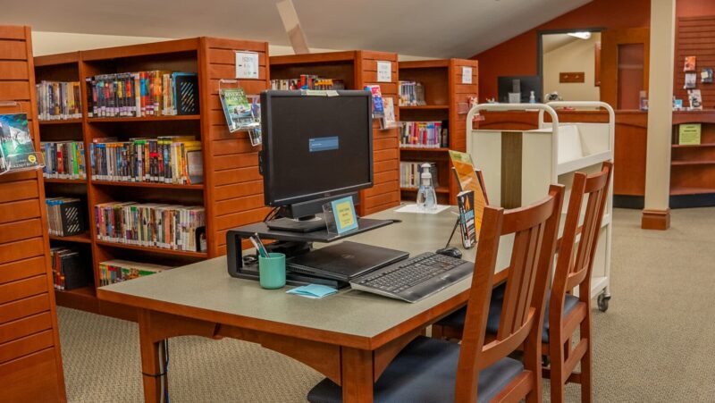 Located on the center table in the library’s main aisle, a library computer holds a searchable catalog of the library’s 10,000+ holdings. Or you can ask library staff about the vast array of titles suitable for all age levels and interests, including a special section of free books and media ready for a new home.